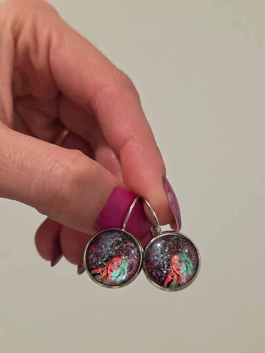 This collection is filled with tiny wearable versions of my paintings, necklaces, earrings, and keychains made to bring art into your everyday life. Each piece is crafted with a glossy glass finish that makes the colors pop and gives the artwork a little shine.