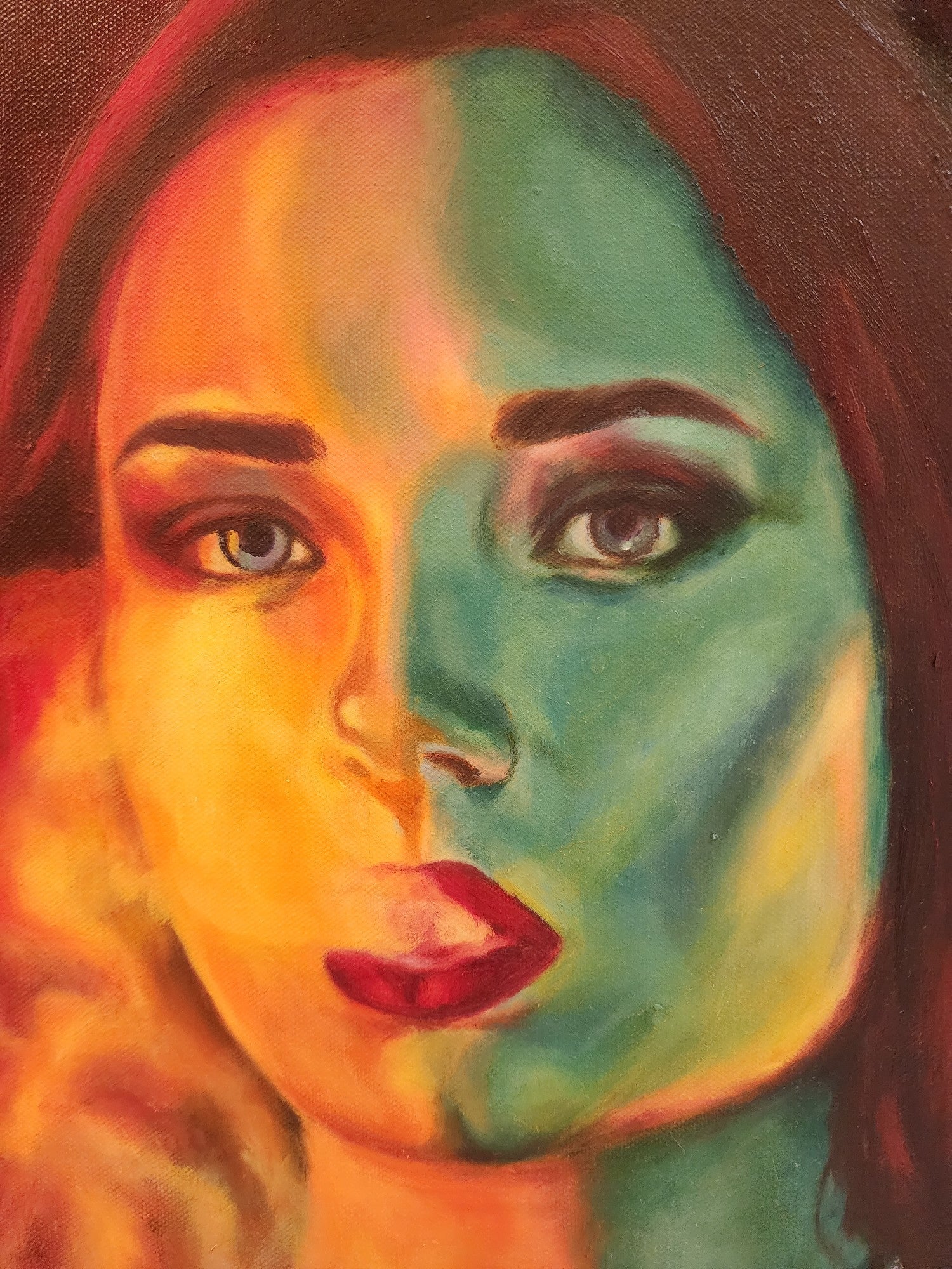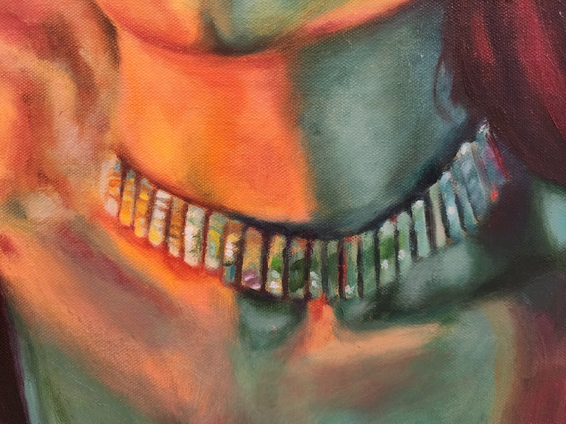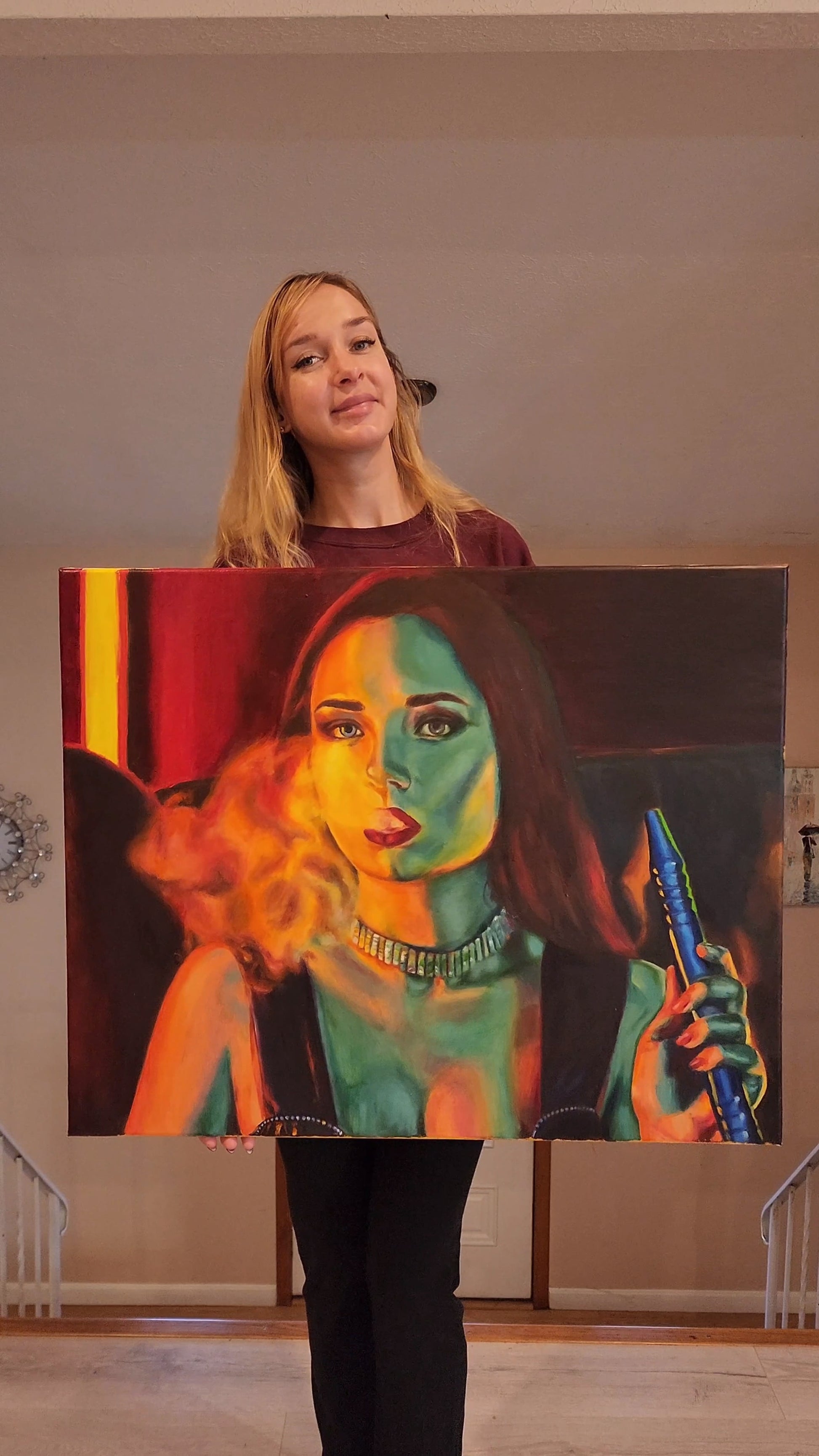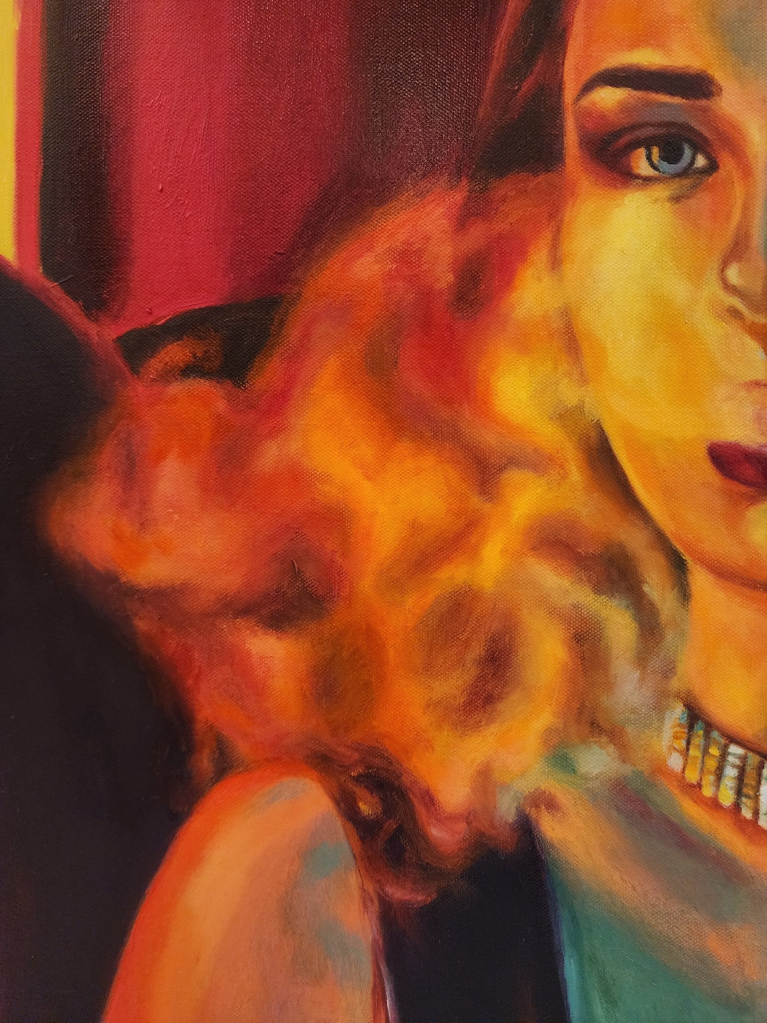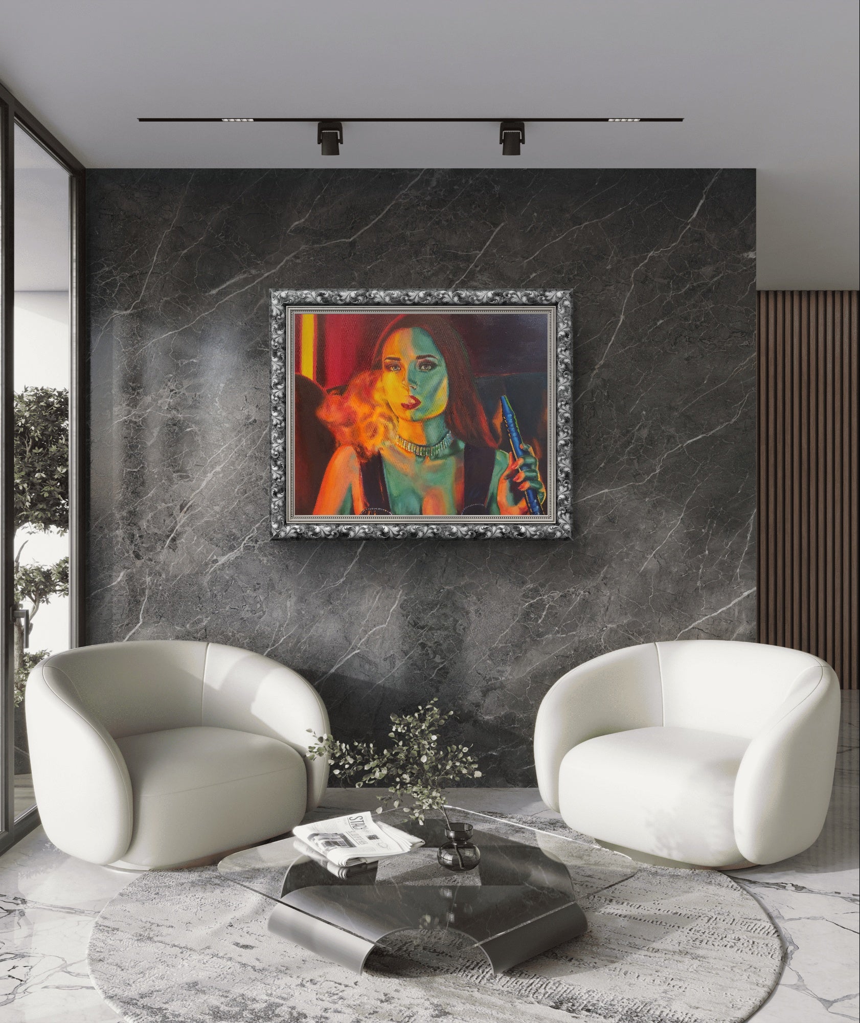 Dieses Gemälde fängt eine kühne und geheimnisvolle Atmosphäre ein. Die zentrale Figur ist eine Frau mit markanten Gesichtszügen, deren Gesicht von lebhaften, kontrastierenden Grün- und Goldtönen erhellt wird. Sie hält eine Wasserpfeife in einer Hand, während eine sanfte Rauchwolke um sie herumschwebt und sich mit den warmen, leuchtenden Tönen des Hintergrunds vermischt. Ihr durchdringender Blick, umrahmt von langen Haaren und einer funkelnden Halskette, zieht den Betrachter in seinen Bann und erzeugt eine Atmosphäre der Faszination und des Selbstvertrauens.