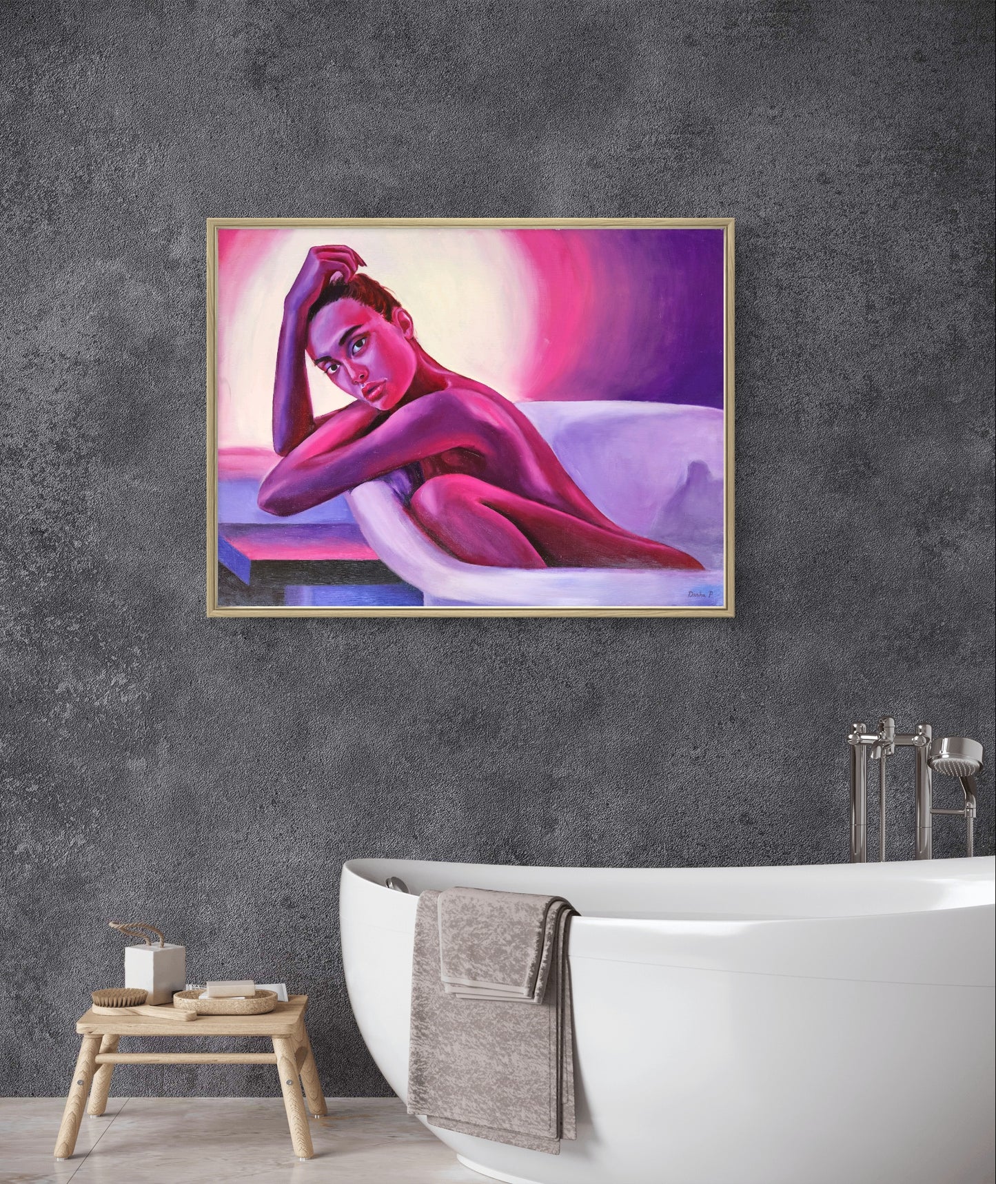 Pintura de una mujer tomando un baño después de un largo día. La pintura está realizada en una combinación de colores violeta y magenta y es brillante y vibrante, pero relajante a la vista al mismo tiempo.