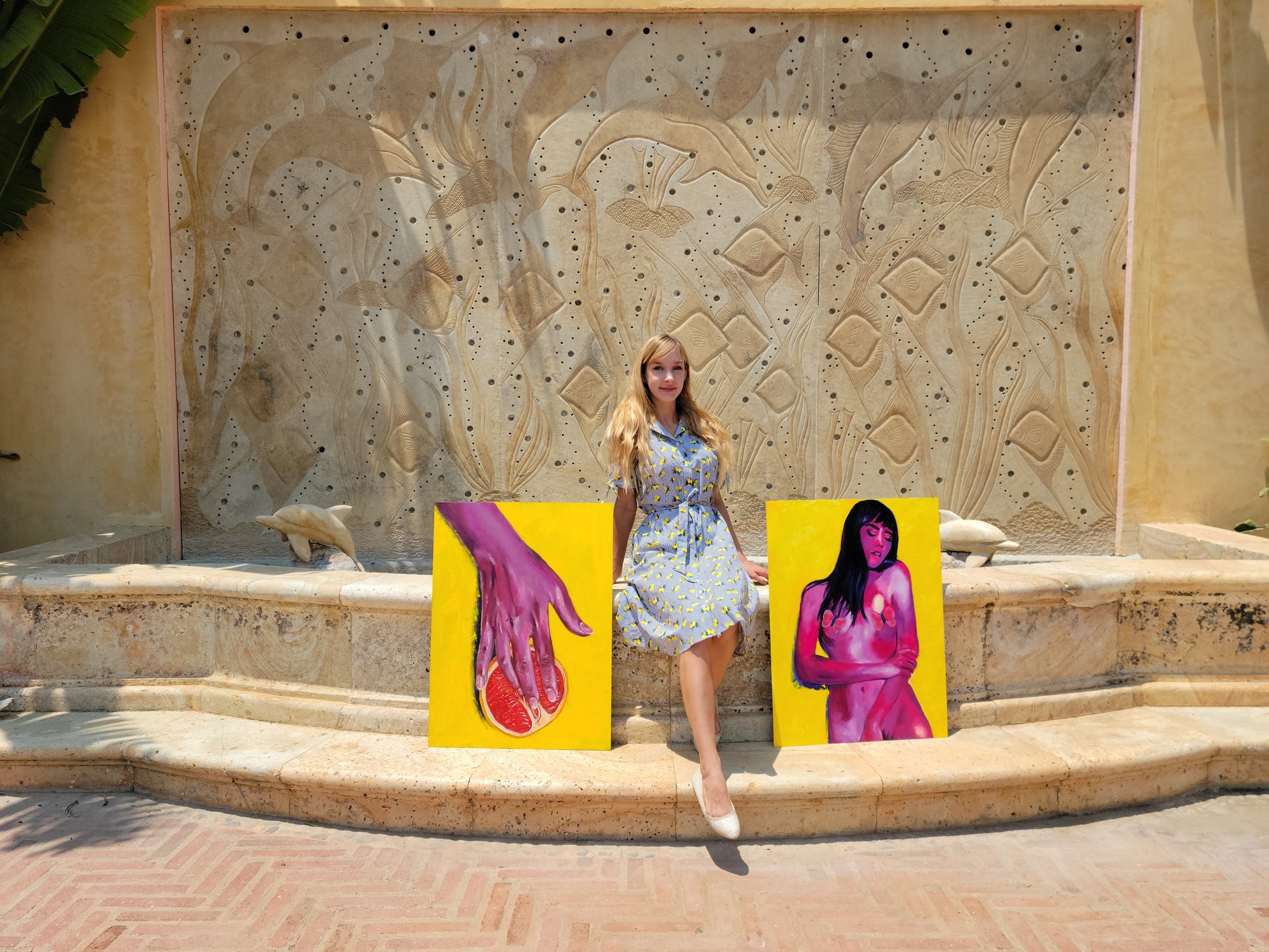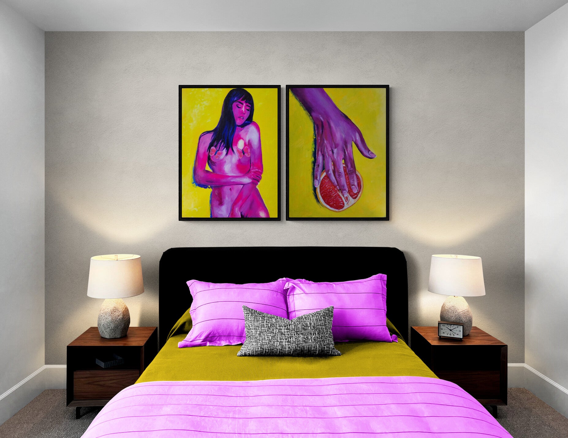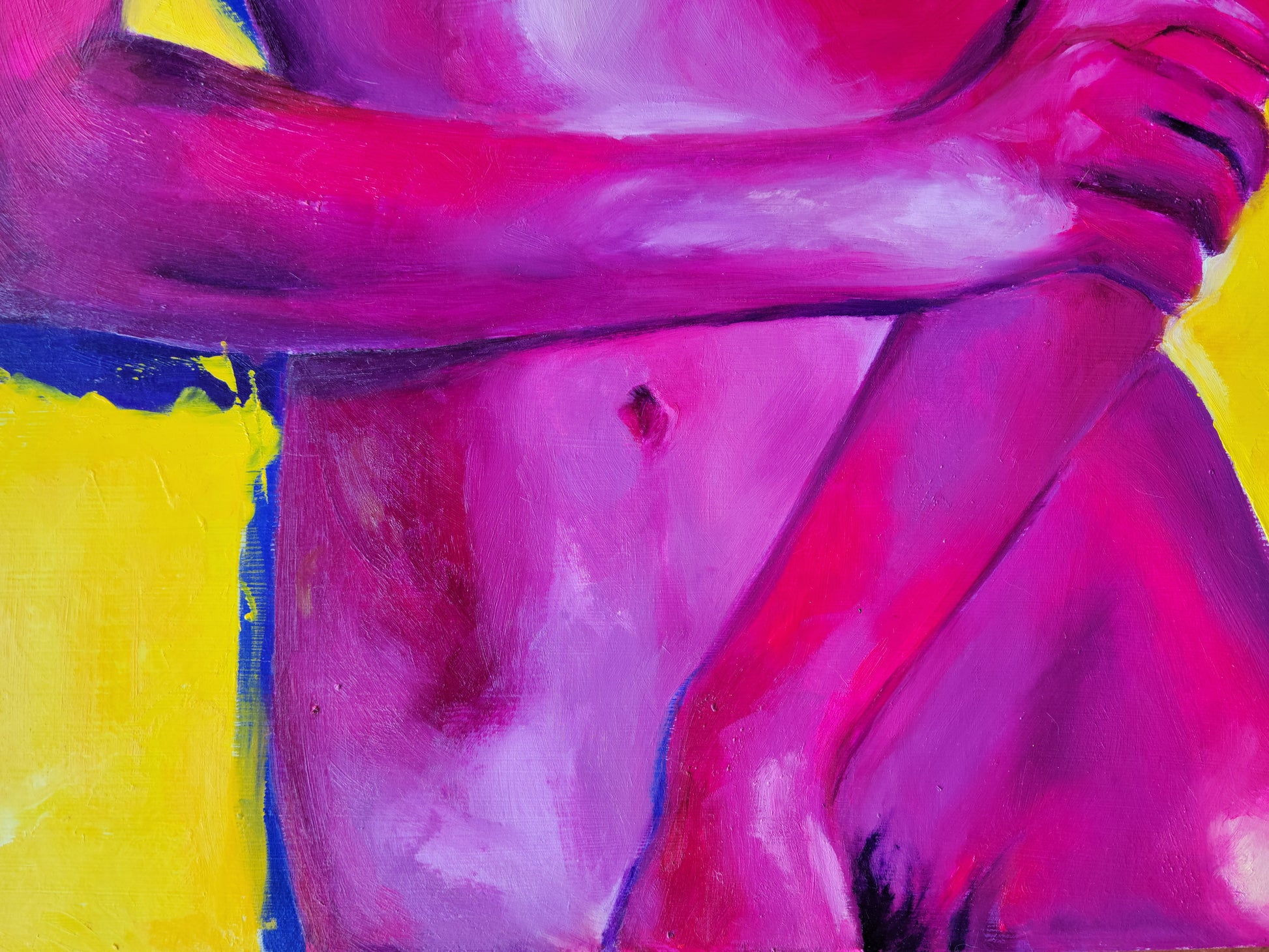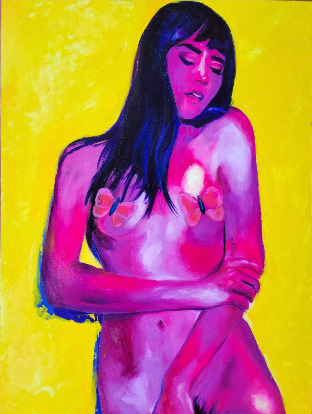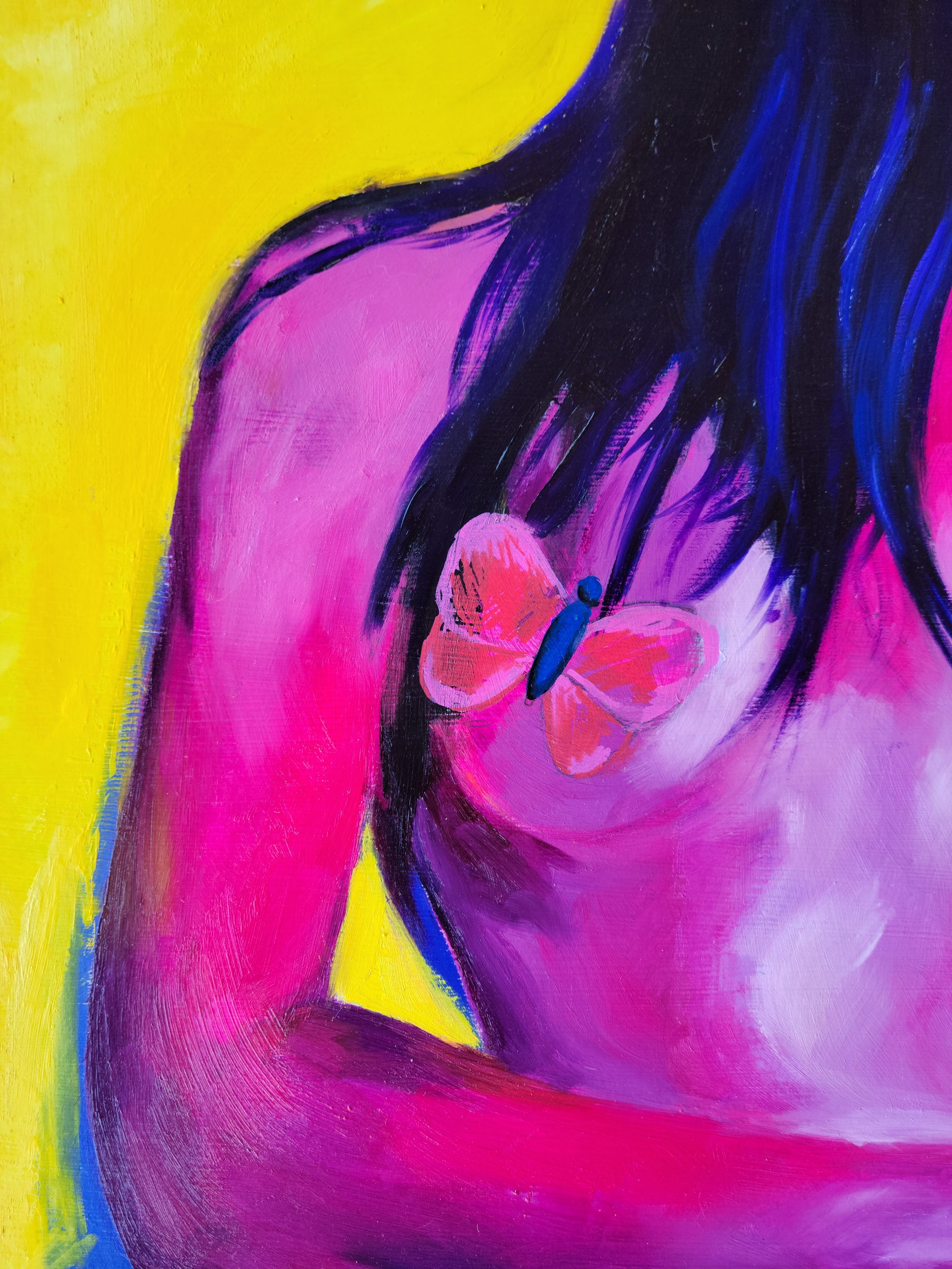 Las mariposas en su pecho sugieren una sensación de transformación y libertad, un toque delicado que insinúa una sensación de despertar o florecimiento. Los vibrantes tonos rosas y morados, combinados con el atrevido fondo amarillo, realzan la intensidad de la escena, aportando una sensación de energía y confianza a este momento privado y personal. Es como si estuviera explorando los límites de la autoconciencia y el amor propio, envuelta en colores que reflejan tanto la audacia como la ternura.