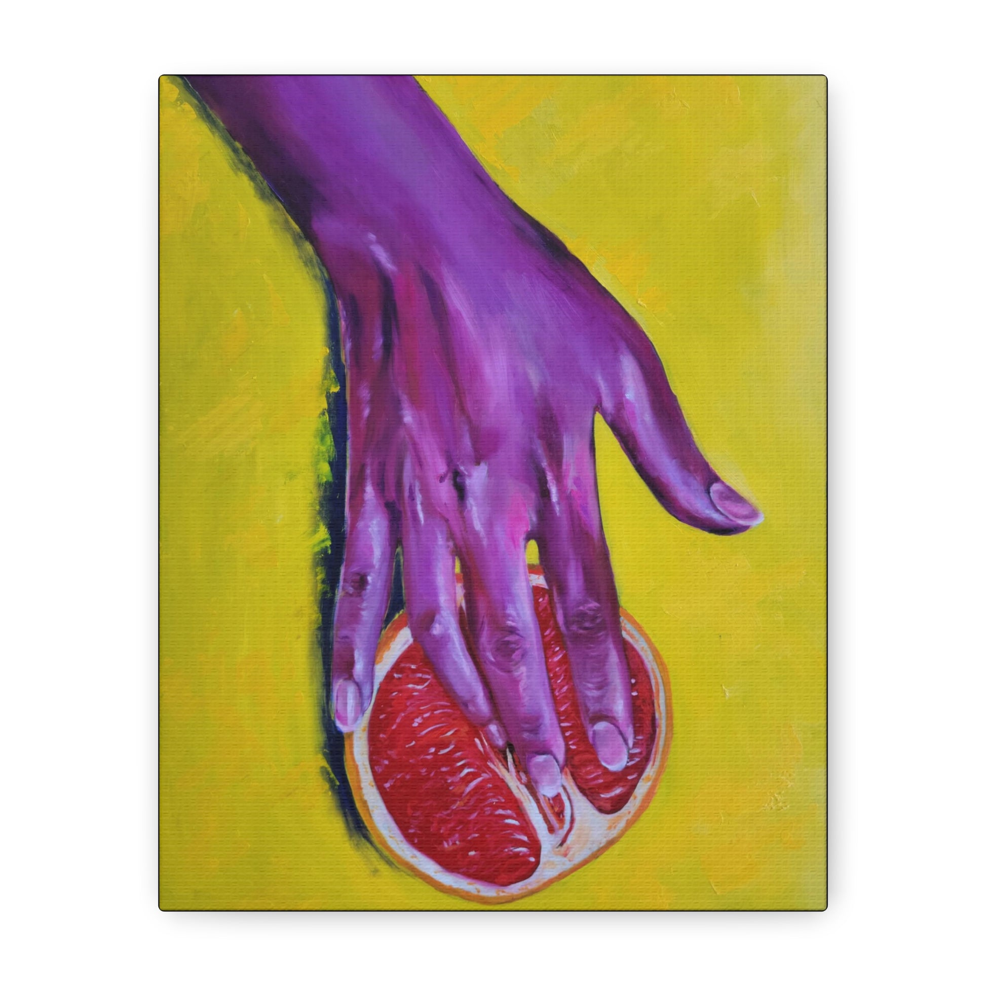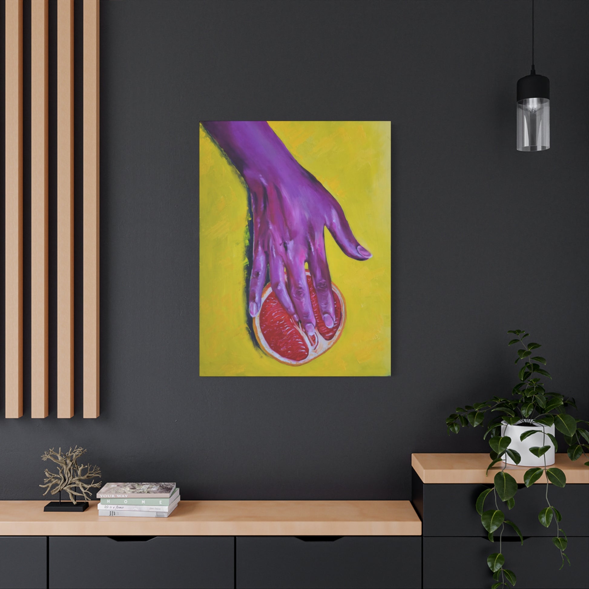 This canvas print features a moment of subtle sensuality and playfulness through the composition and choice of colors. The vibrant purple hand gently resting on the halved grapefruit against a bold yellow background creates a striking contrast, drawing attention to the textures and shapes. The hand’s placement and the use of rich, saturated tones hint at themes of pleasure and self-discovery, using the grapefruit as a suggestive symbol. The fruit’s juicy, red interior contrasts with the smooth, firm hand, evoking a tactile, almost intimate interaction. This piece feels like a celebration of touch and sensation, artfully hinting at desire without needing to spell it out.