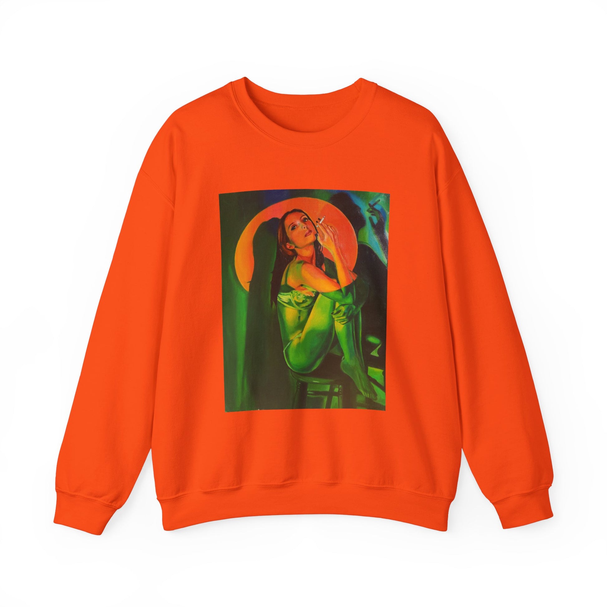 Moon Magic features a captivating scene of a woman sitting in a relaxed pose, bathed in green and orange tones. The vibrant colors and dramatic lighting create a striking contrast, highlighting her figure and the smoke from her cigarette. The background includes a mysterious silhouette, adding an element of intrigue to the composition.