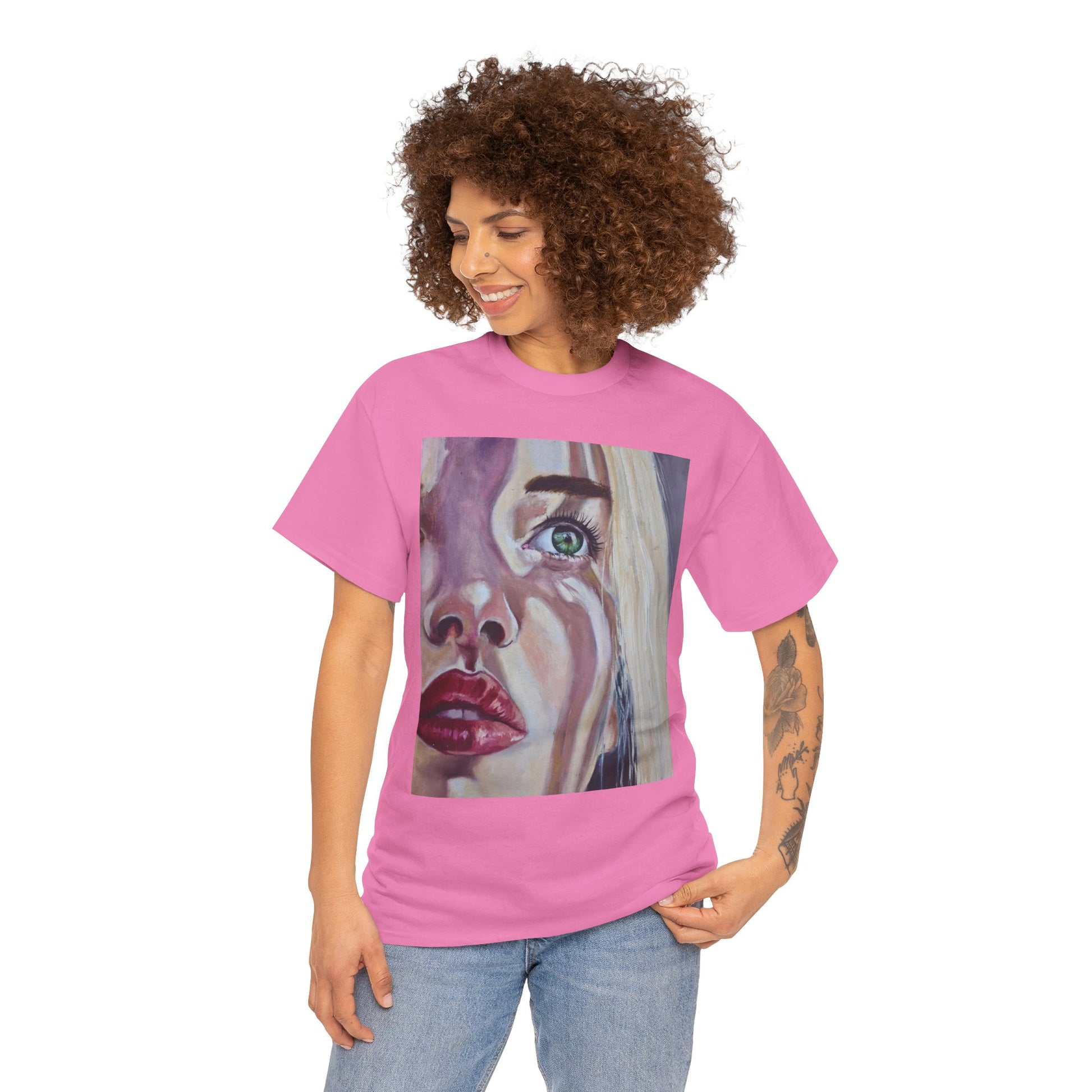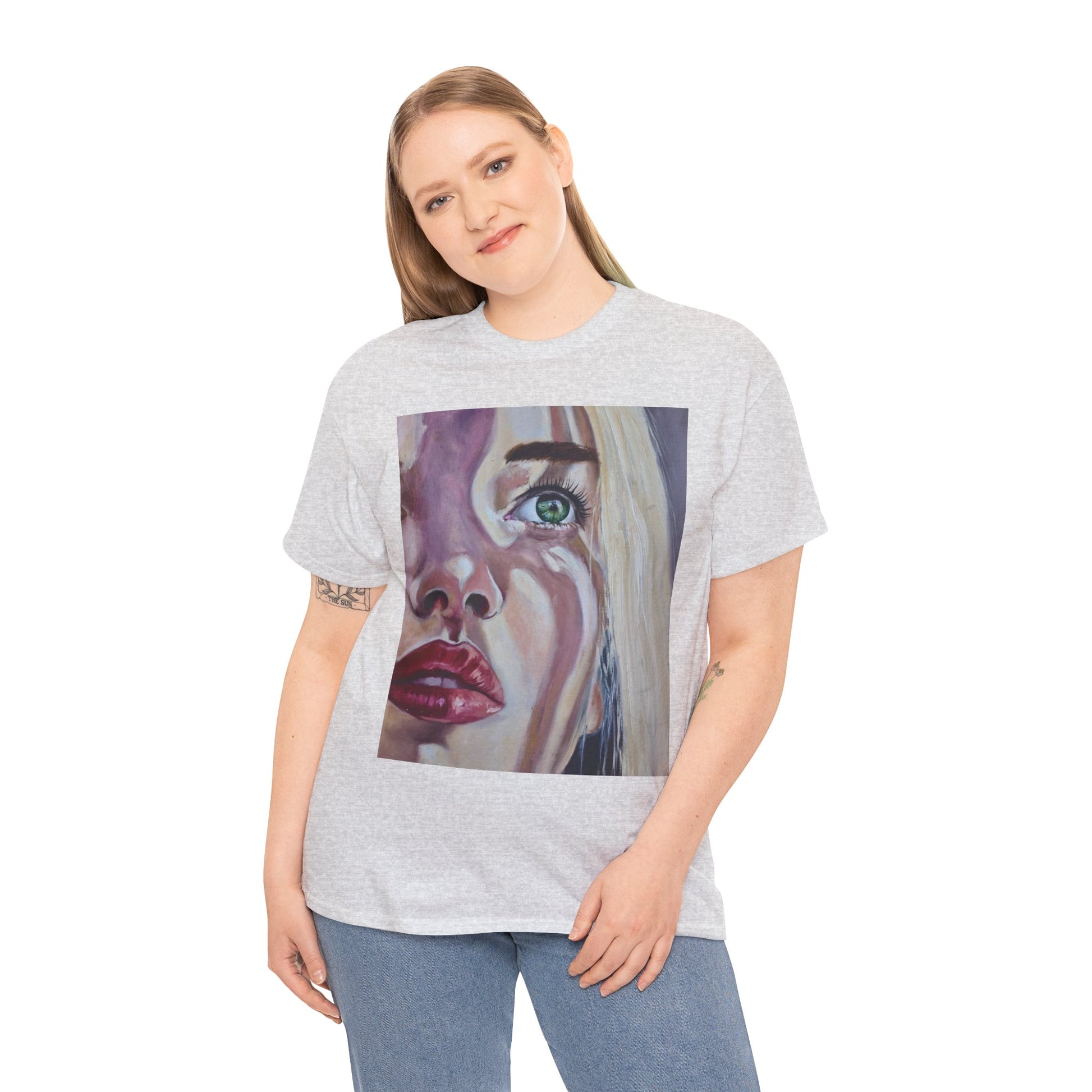 Up close and impossible to ignore. This T-shirt features a cropped portrait from my original painting—sharp green eye, flushed skin, and glossy lips that feel like they’re just about to move. It’s bold, a little intense, and full of presence. Wear it when you want your shirt to look back.